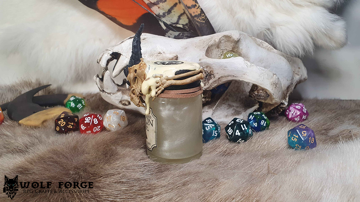 D20 Potion Rollers are glass jars filled with water, dye and metallic powders to create a potion-like magical appearance fit for any RPG aesthetic. Every Potion Roller features a D20 dice that floats- simply shake your jar* and flip it over and watch as the dice floats and reveals your roll.