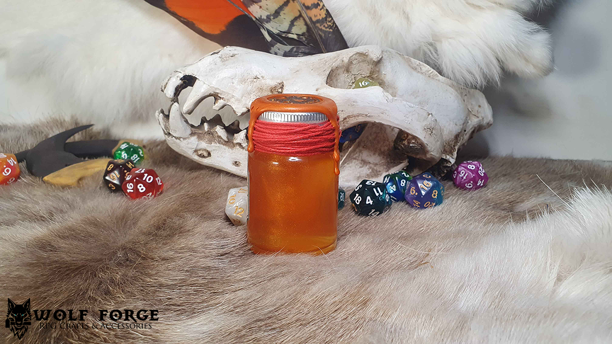D20 Potion Rollers are glass jars filled with water, dye and metallic powders to create a potion-like magical appearance fit for any RPG aesthetic. Every Potion Roller features a D20 dice that floats- simply shake your jar* and flip it over and watch as the dice floats and reveals your roll.