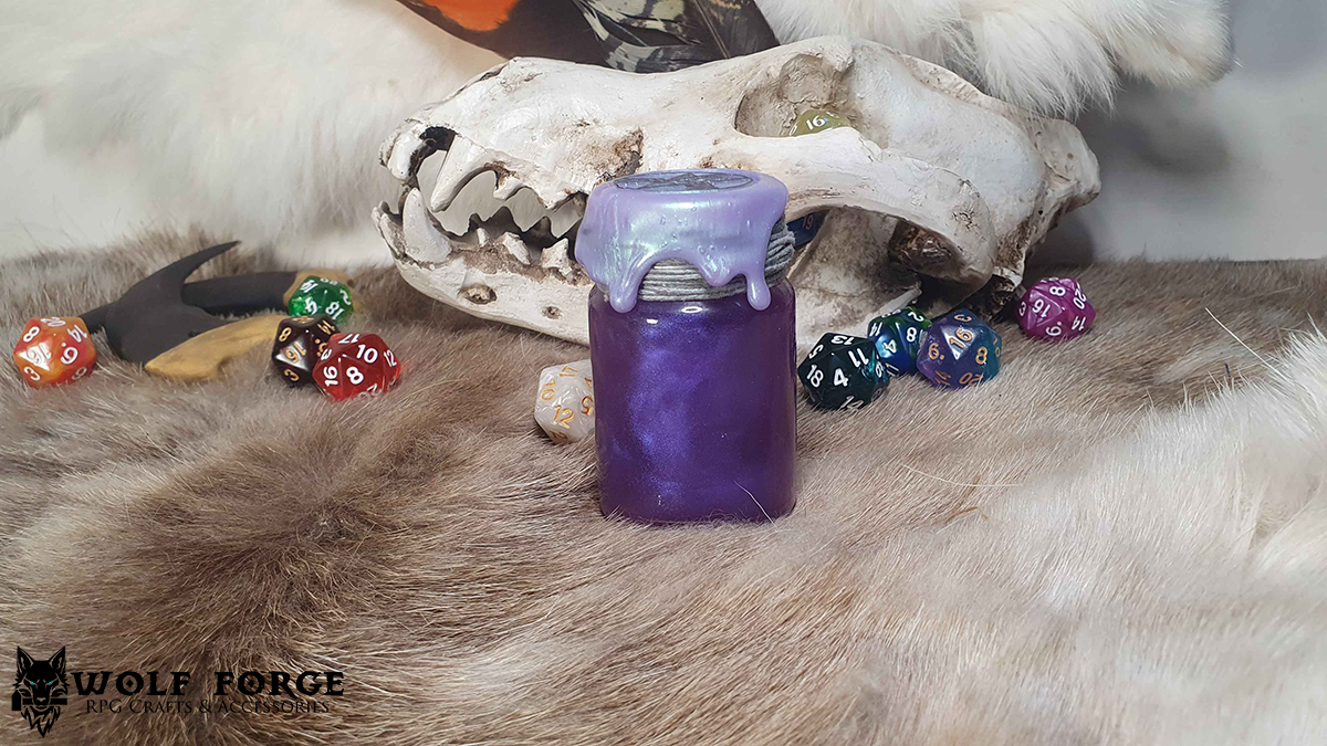 D20 Potion Rollers are glass jars filled with water, dye and metallic powders to create a potion-like magical appearance fit for any RPG aesthetic. Every Potion Roller features a D20 dice that floats- simply shake your jar* and flip it over and watch as the dice floats and reveals your roll.