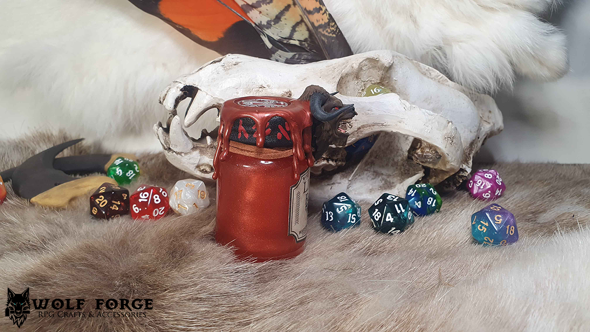 D20 Potion Rollers are glass jars filled with water, dye and metallic powders to create a potion-like magical appearance fit for any RPG aesthetic. Every Potion Roller features a D20 dice that floats- simply shake your jar* and flip it over and watch as the dice floats and reveals your roll.