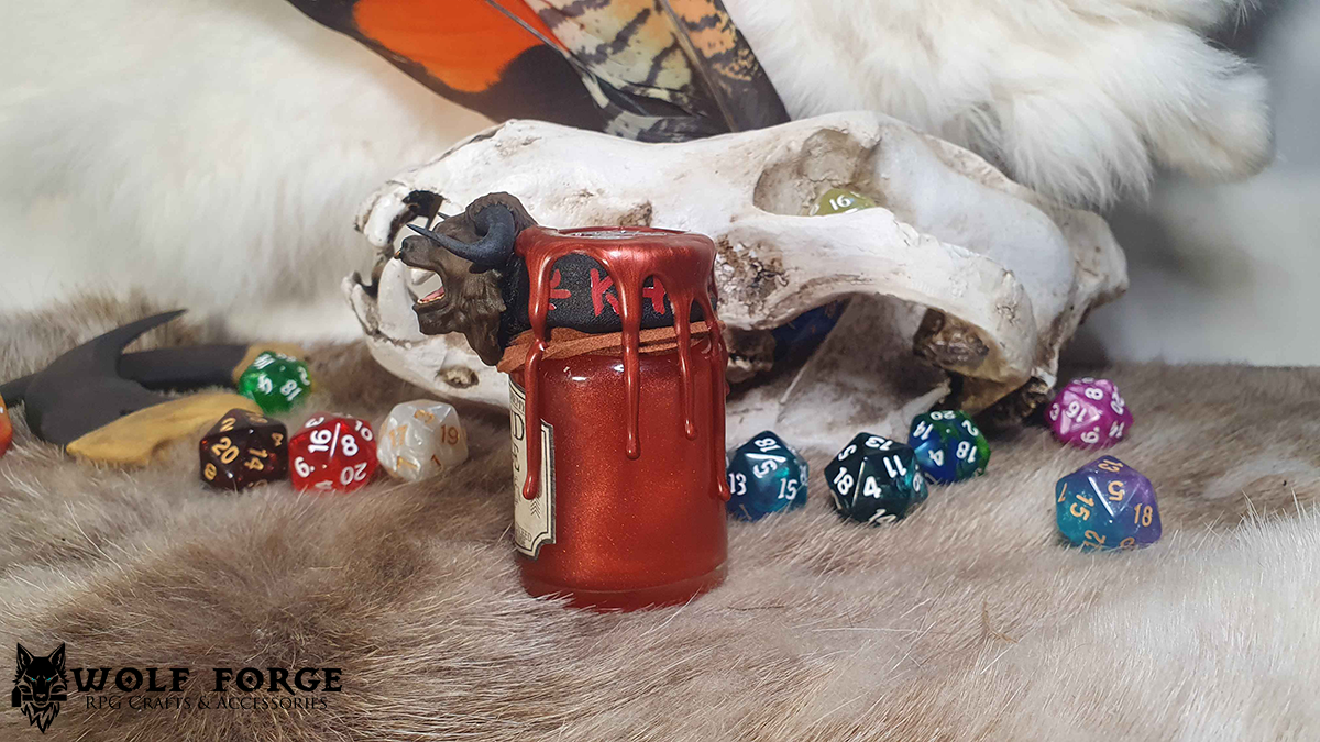 All potion rollers are handmade. Strength of dye and powder, amount of wax drips, colouration of mixed colour wax seals and colour of dice may vary, but will always fit the aesthetic of the individual potion.