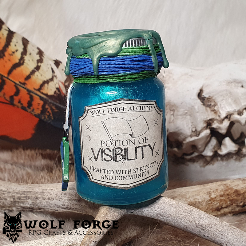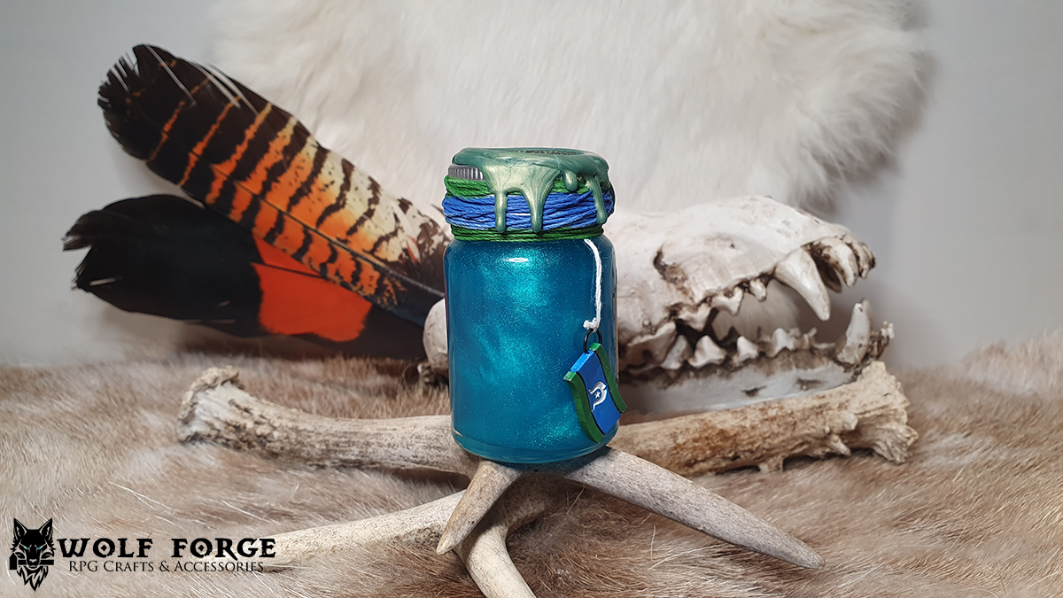D20 Potion Rollers are glass jars filled with water, dye and metallic powders to create a potion-like magical appearance fit for any RPG aesthetic. Every Potion Roller features a D20 dice that floats- simply shake your jar* and flip it over and watch as the dice floats and reveals your roll.